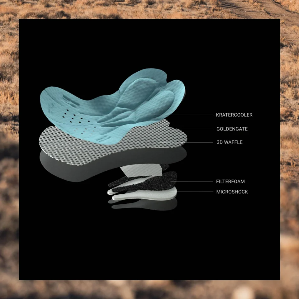 De eerste insert aangepast aan grindpaden, gemaakt van 2-laags traagschuim met dubbele dichtheid. Een superzacht, 19 mm dik platform dat micro-trillingen absorbeert en sterke schokken opvangt.